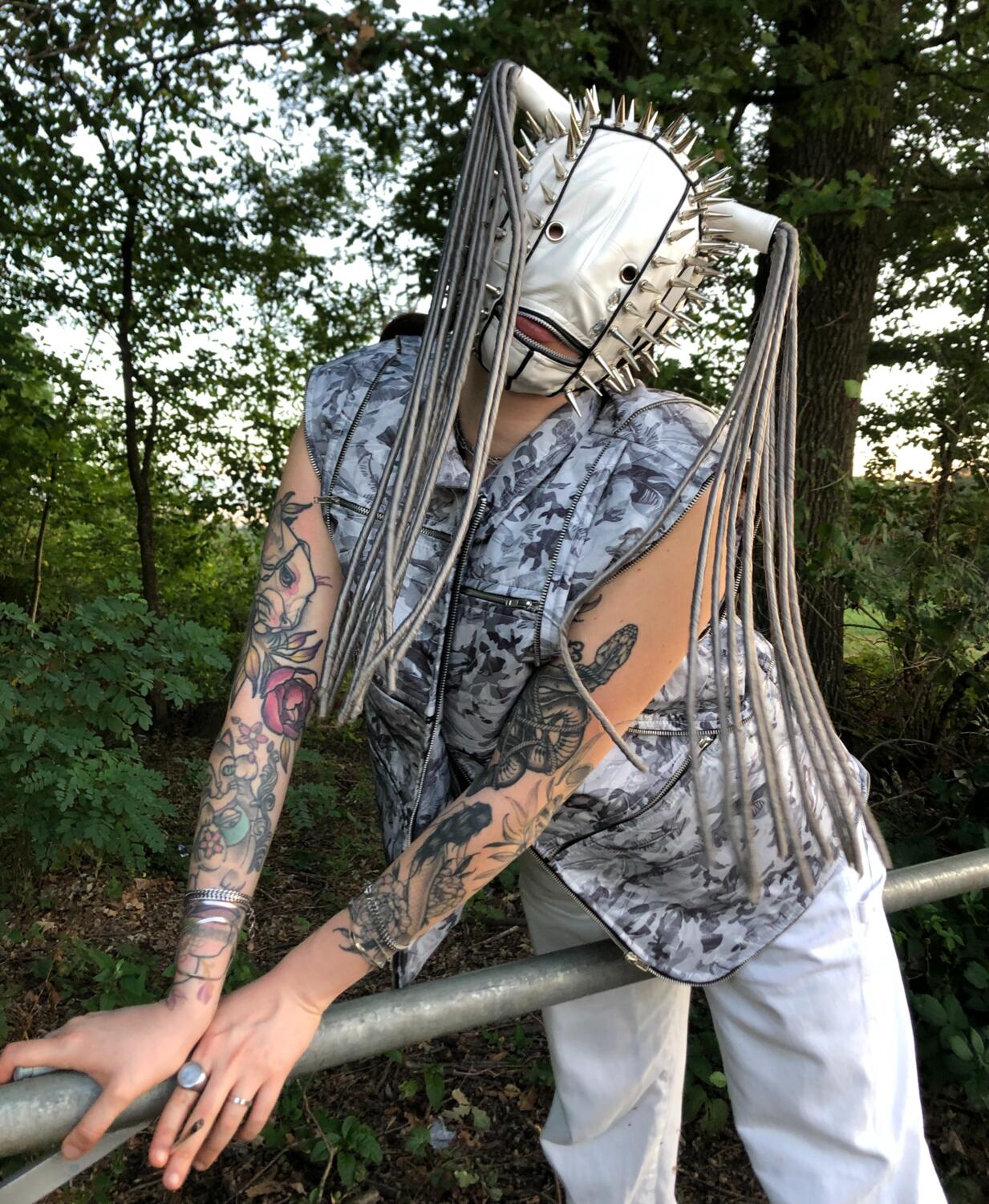 Maschera realizzata artigianalmente a mano, in eco pelle foderata in cotone , borchie e cerniere in acciaio inox e cyber dreads sintetici